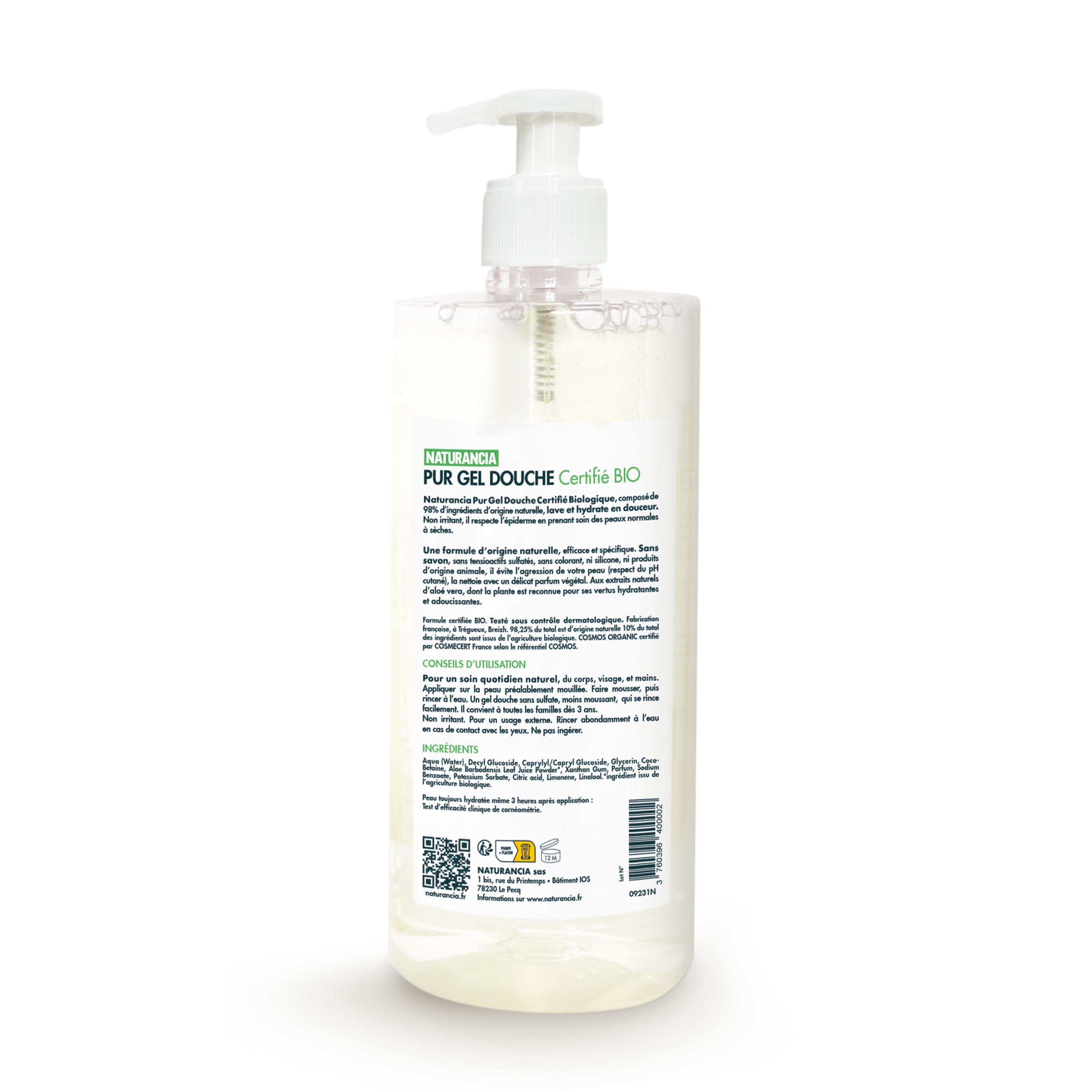 ALOE PUR GEL DOUCHE BIO Naturancia, composé de 98% d’ingrédients d’origine naturelle, lave et hydrate en douceur. Non irritant, il respecte l’épiderme en prenant soin des peaux normales à sèches. Une formule d’origine naturelle, efficace et spécifique. Sans savon, sans tensioactifs sulfatés, sans colorant, ni silicone, ni produits d’origine animale, iI évite l’agression de votre peau (respect du pH cutané), la nettoie avec un délicat parfum végétal. Aux extraits naturels d’aloé vera, dont la plante est reconnue pour ses vertus hydratantes et adoucissantes. Formule certifiée BIO. Testé sous contrôle dermatologique. Fabrication française, à Trégueux, Breizh. 98,25% du total est d’origine naturelle 10% du total des ingrédients sont issus de l’agriculture biologique. COSMOS ORGANIC certifié par COSMECERT France selon le référentiel COSMOS.