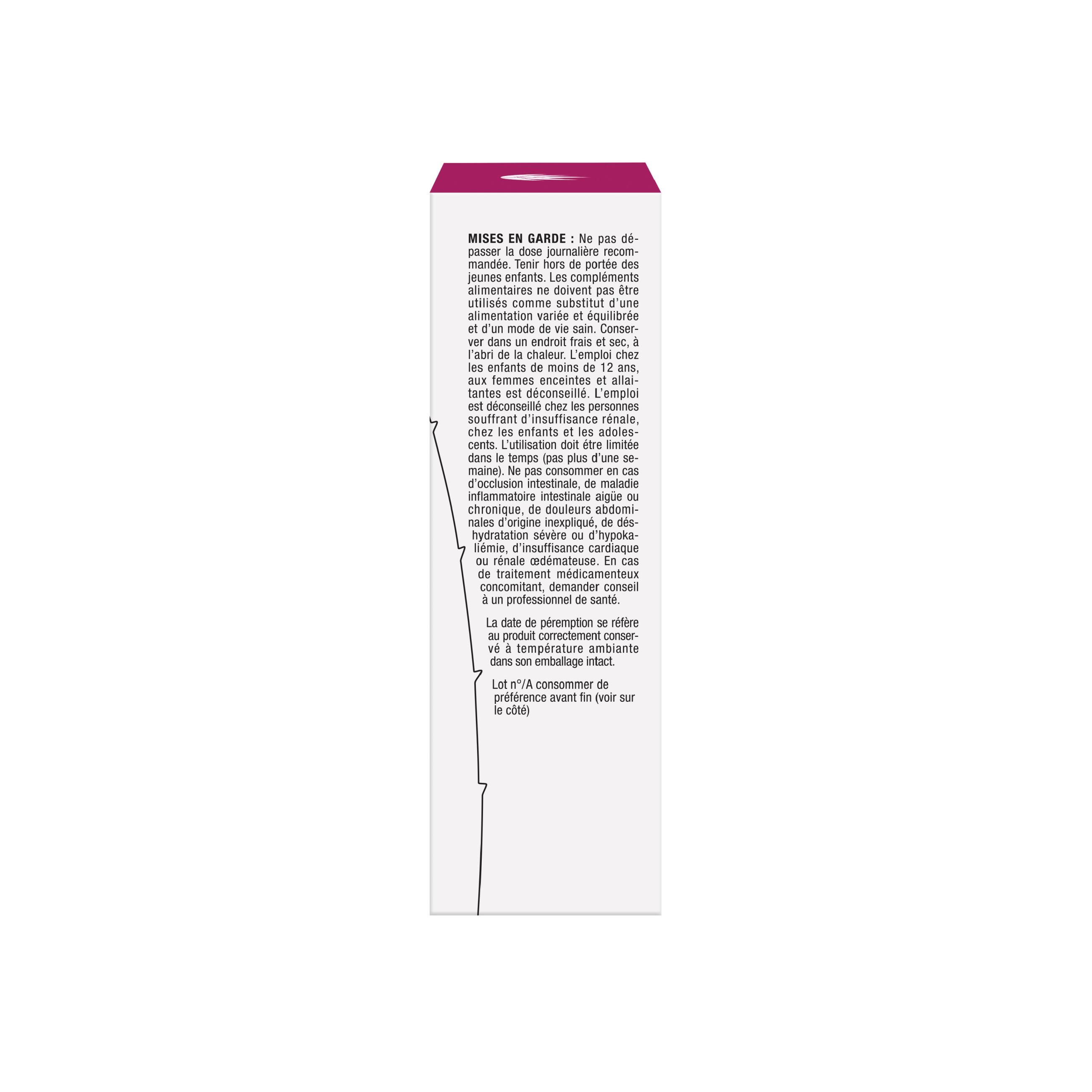 COMPLÉMENT ALIMENTAIRE • L’emploi chez les enfants de moins de 12 ans, aux femmes enceintes et allaitantes est déconseillé. L’emploi est déconseillé chez les personnes souffrant d’insuffisance rénale, chez les enfants et les adolescents. L’utilisation doit être limitée dans le temps (pas plus d’une semaine). Ne pas consommer en cas d’occlusion intestinale, de maladie inflammatoire intestinale aigüe ou chronique, de douleurs abdominales d’origine inexpliqué, de dés hydratation sévère ou d’hypokaliémie, d’insuffisance cardiaque ou rénale œdémateuse. En cas de traitement médicamenteux concomitant, demander conseil à un professionnel de santé.